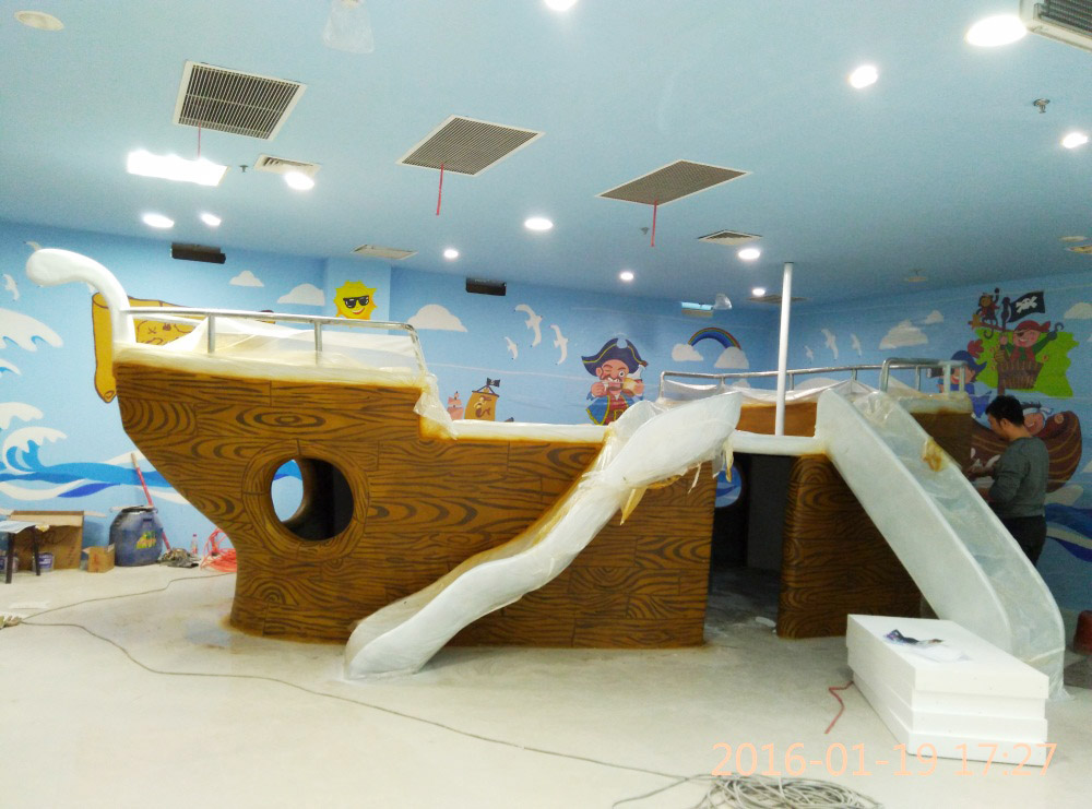 大型玻璃鋼游樂船雕塑竣工。2016年1月15-1月19日安裝于山東省濱州市黃河五路渤海十路銀座商城黃河店四樓。